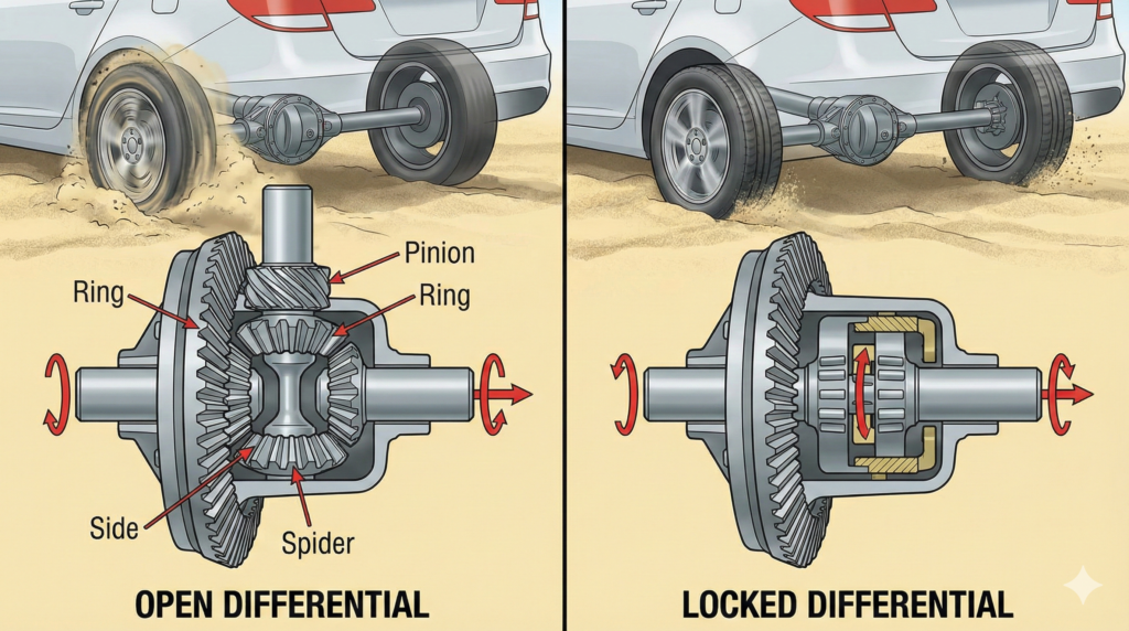 私が過去に目撃した事例では、軽トラック(2WD)が砂浜の入り口で、左後輪だけが激しく砂を跳ね上げ、右後輪は全く回らずに立ち往生していました。この「デフの弱点」こそが、砂浜で多くの車を餌食にする最大の罠です。本格的な四駆であれば、ボタン一つで左右のタイヤを直結(デフロック)して無理やり両輪を回せますが、生活四駆にはその「強引な突破力」が備わっていません。