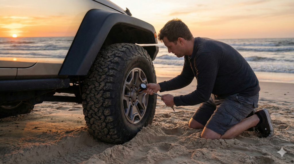 砂浜でスタックしてしまった際、最も効果的で即効性のある脱出術は「タイヤの空気圧を下げること」です。空気圧を下げることでタイヤが少し潰れ、地面との接地面積(フットプリント)が劇的に広がります。これにより、雪の上を「かんじき」で歩くように、車体が砂に沈み込むのを防ぎ、浮力を得ることができるのです。砂浜走行のプロたちの間では、まさに常識とも言えるテクニックですね。